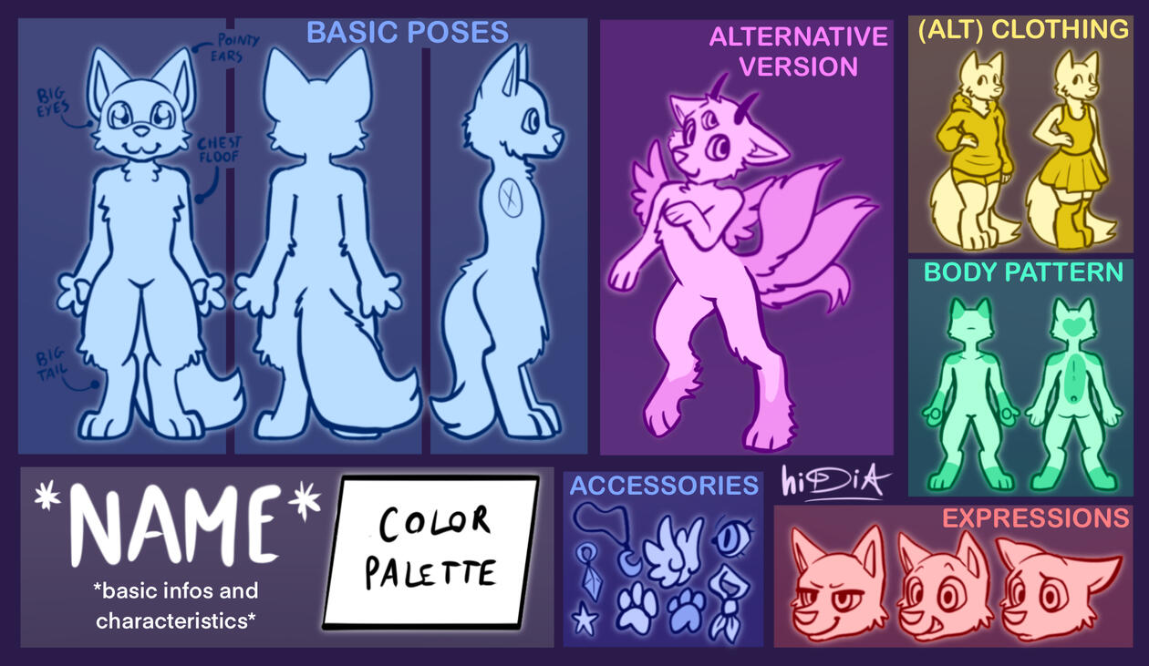 You can choose among these options shown in the image• Basic Pose (you can choose between front, back, profile, 3/4, or a custom pose of your choosing)• Alternative Version (in case your character has some specific body parts that change or transform)• Alternative Clothing (in case your character wears many types of clothing, if any)• Body Pattern ( this comes in handy when you want to show accurately your character's markings/patterns/spots/etc...)• Accessories/character details ( this includes specific objects or also a close up of your character's body part that needs to be better shown, such as eyes/mouth/hands/etc..)• Expressions (to better show how your character is when happy/sad/angry/jealous/embarrassed/etc...)